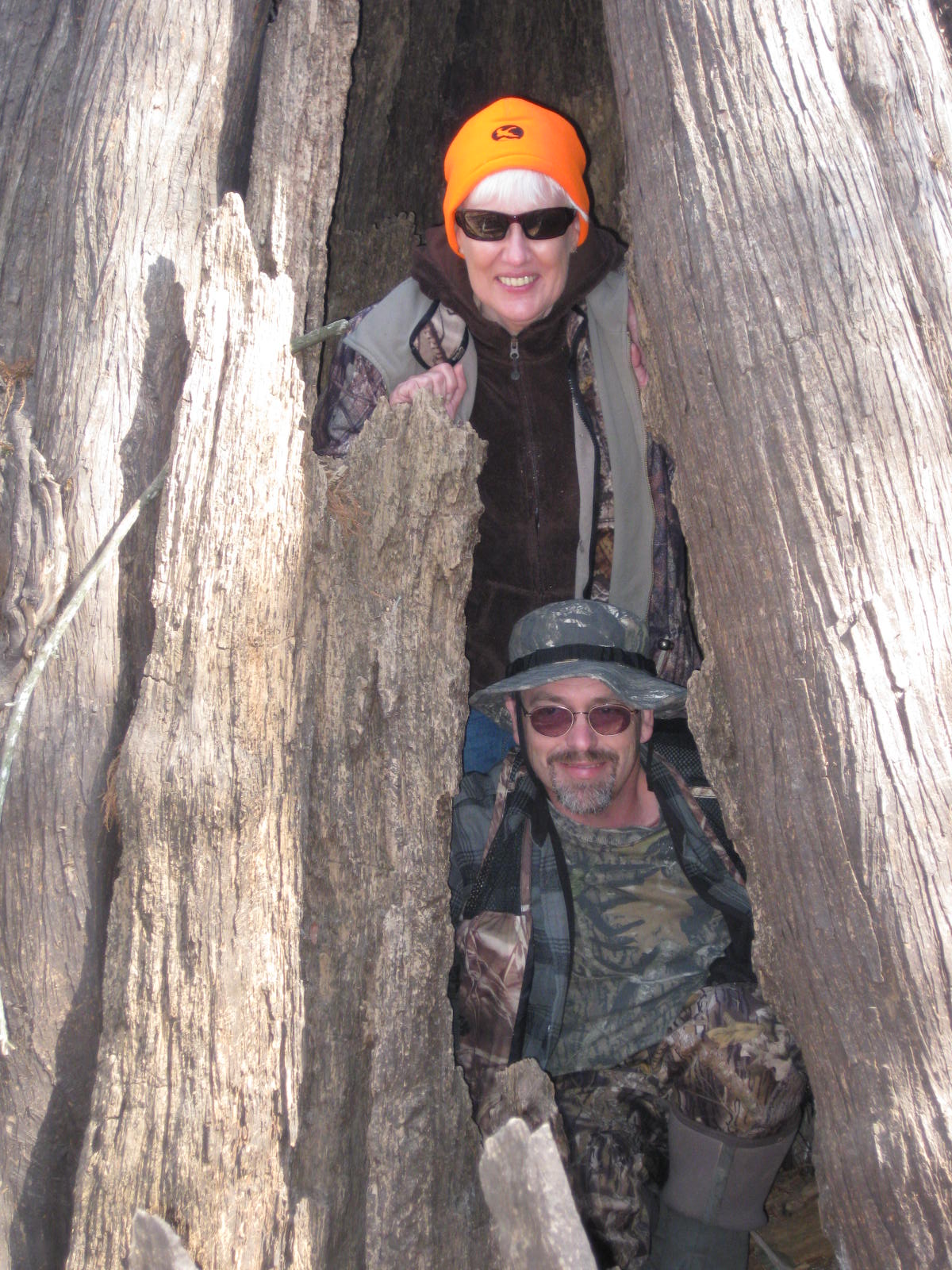 My favorite photos of the day. Our group at the lunch stop. Debo and Cowper in the hollow cypress and Liz and Mike in the beaver race. The big splash on the right side of the picture is the beaver showing his displeasure and giving a big tail slap before diving.