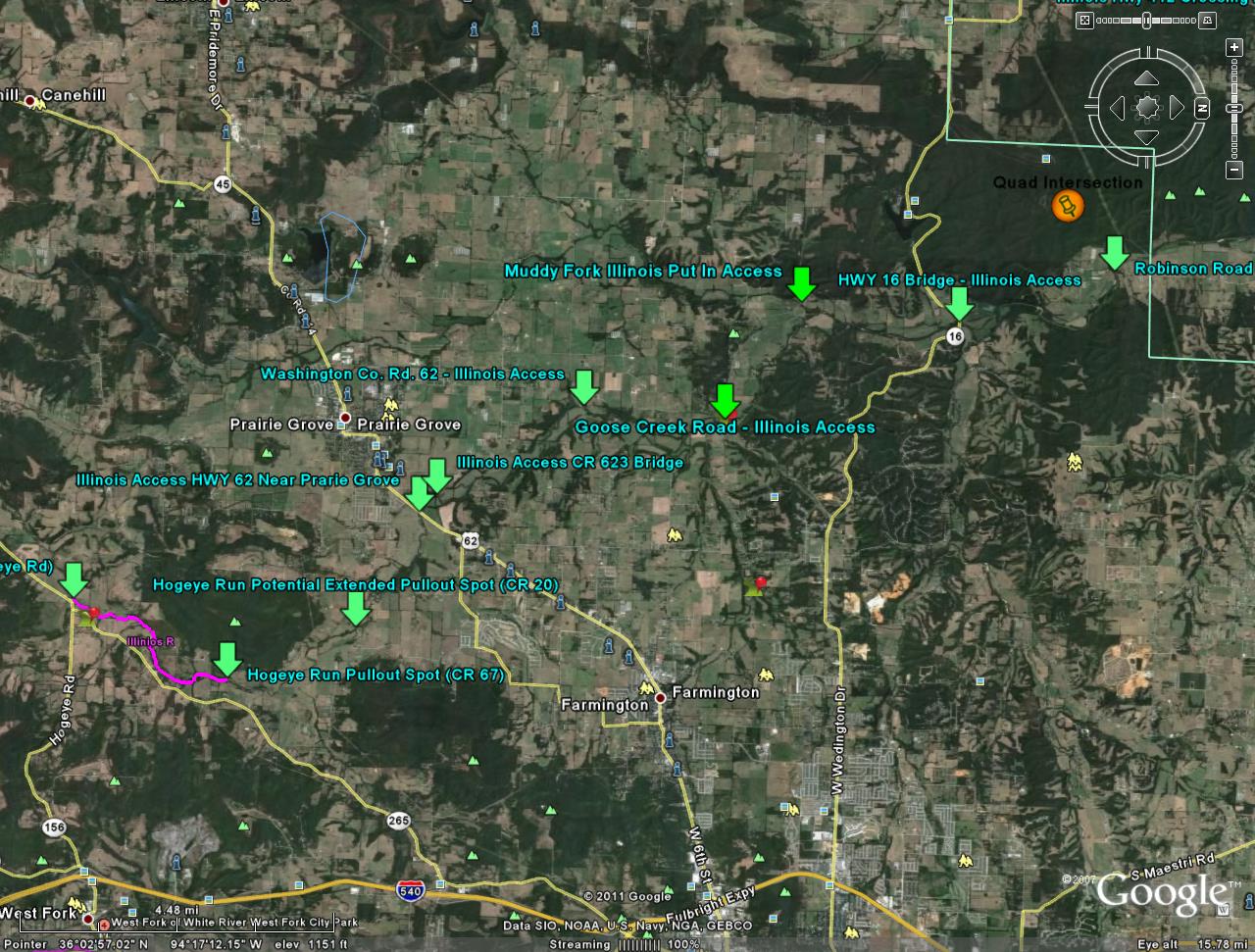 I'm also heavily addicted to Google Earth (literally it can consume hours with "virtual exploration"). I searched for extended pullout spots for the Hogeye run, and found many. And your post got me going, and I found a few more today. Of course these are personally untested so far, but perhaps a few others also infected with the wanderlust virus can join me for an Upper Illinois Exploration Expedition over the next few months.