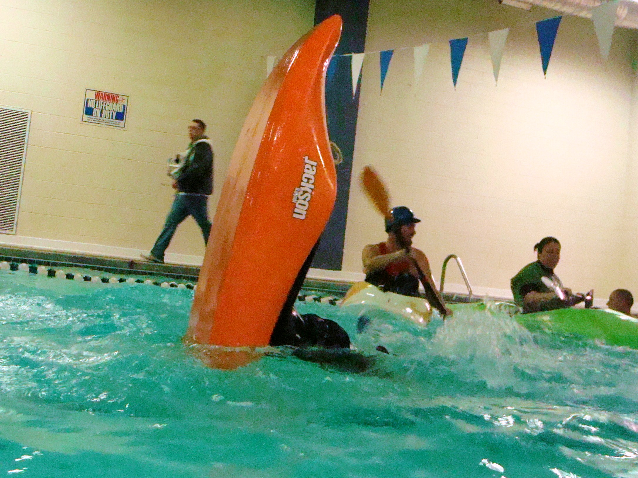 These roll sessions are intended for boaters who own and bring their own equipment; participants will usually allow others to try out their equipment, but please do not expect someone to supply equipment to you for the whole night unless you have worked that out with them. We hope to have several volunteer instructors at each session to assist people working on their rolls but can not promise the availability of instructors.