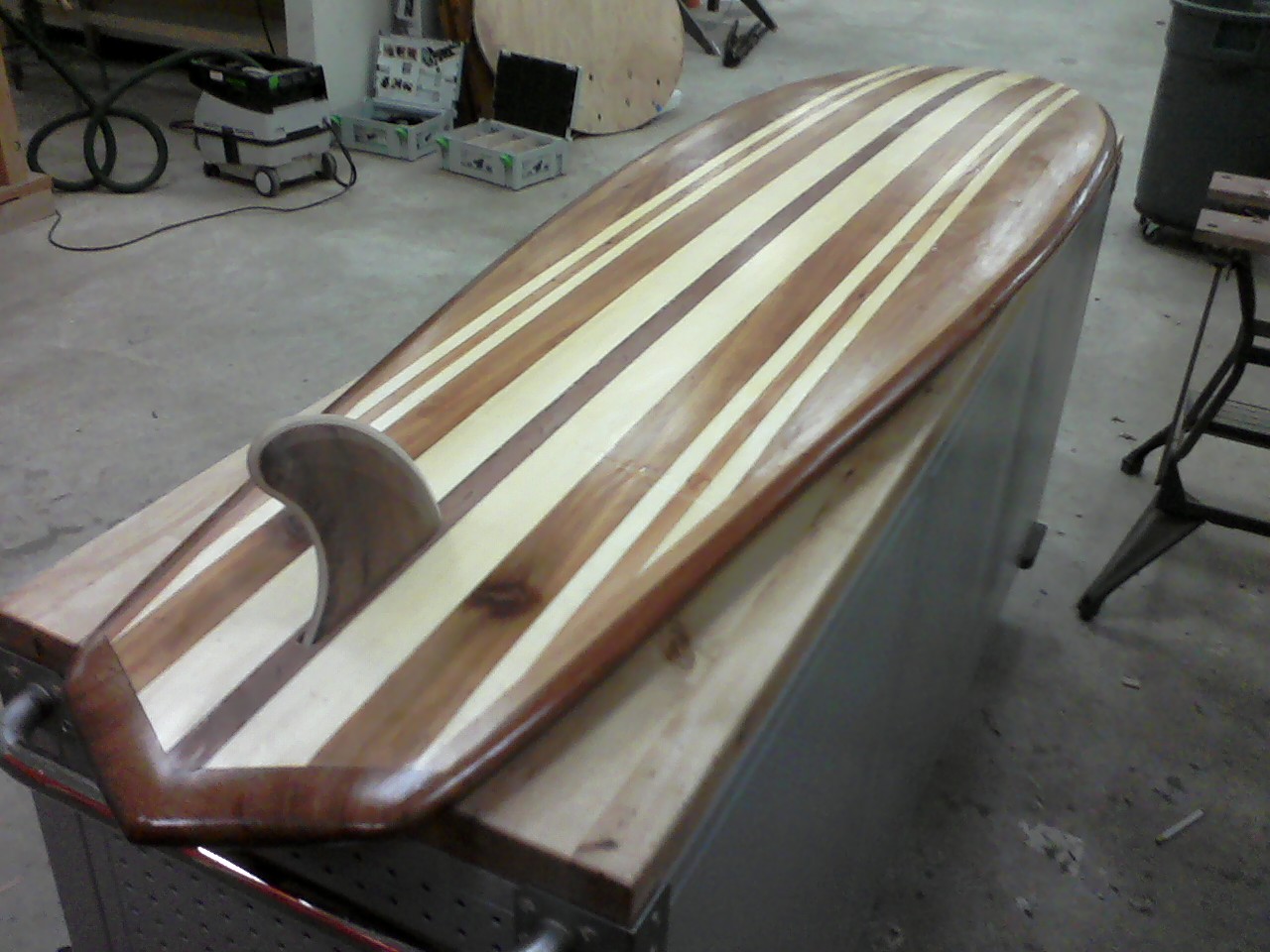 That's awesome! I'm hoping to use my board on the endless wave out on the lake as well. I used different widths of western red cedar and Aspen Pine strips. the aspen pine boards i got from lowes and love the consistant grain and white color! Great for contrast against the red cedar strips. to make the inside molds/profiles i used 3/4" mdf and drilled holes in them to make them lighter. then fiberglassed and epoxy just like your canoe.