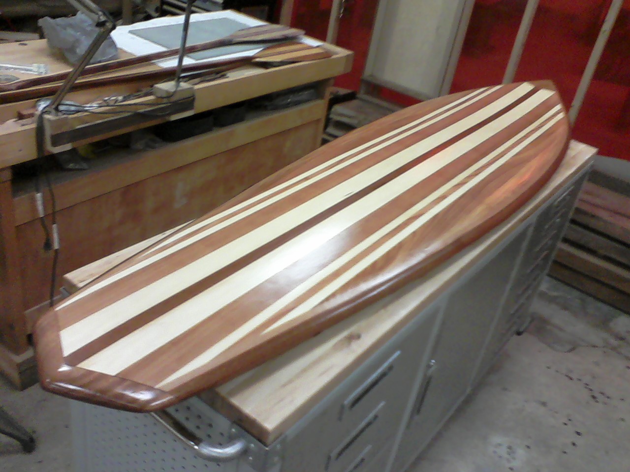 hey thanks lucas. ive looked into making a surfboard but finding thick balsa boards was a bit of a problem. back home on the lakes after climbing all day, we used to hop in the boat, fill the hull with water, have everyone sit on one side and then surf the endless wave it created. super fun. what materials did you use? the model is the abenaki and i am studying a few different technique dvds, you tube, and other pamphlets. the most helpful book has been susan van levinson's guide to wood strip canoe building.