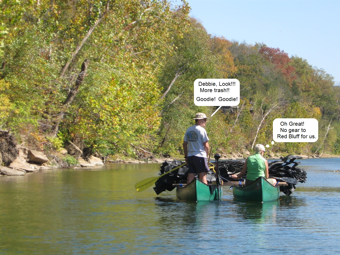Gilbert to Red Bluff was only 3 miles; we had 3 canoes fully loaded, partial loads in several others. The lower stretch is 25 miles; how would we get enough boats and participants to haul all the trash we’d find? Simple math says we’d need 30+ boats if we were to tackle it on one trip.