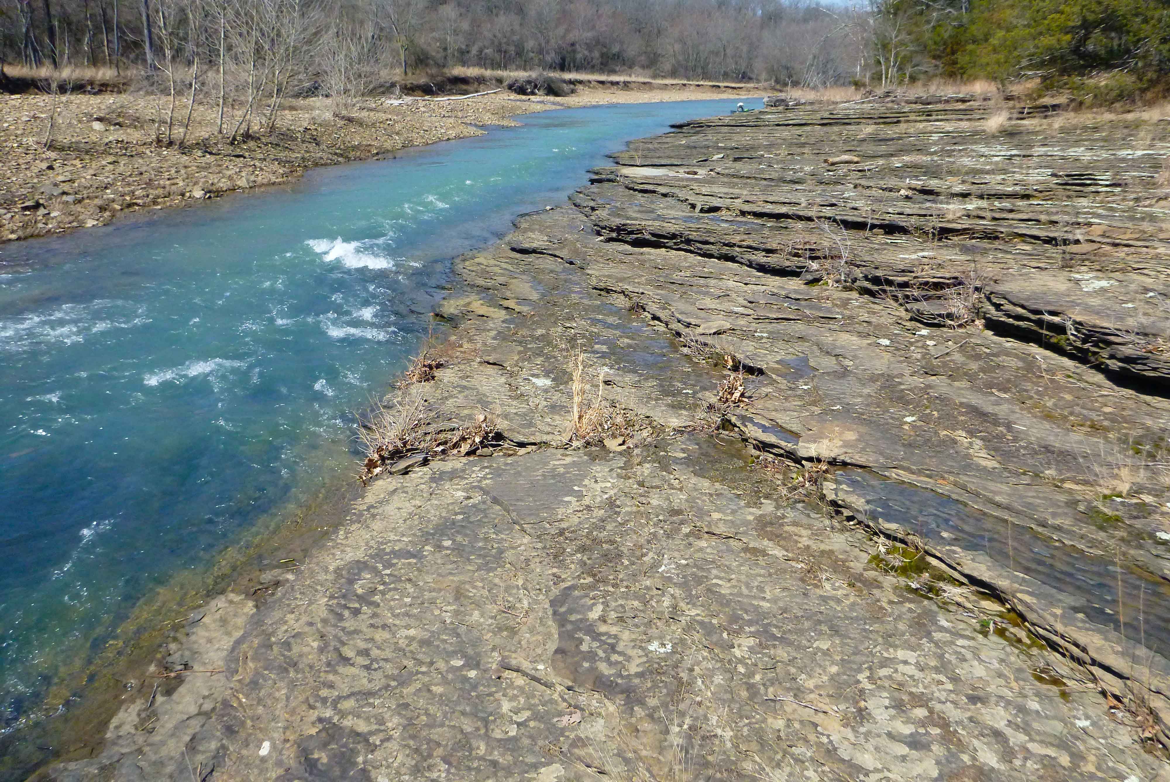 I'm guessing that it was a 10/11 mile float. The first 4 miles was very similar to the middle section of the Buffalo. There were a lot of chutes and few pools. Looked like at higher flow there would be some fun whitewater. I don't know what the level were, but it felt similar to floating the Mulberry at 2'. Low, but always a line. Trees weren't an issue on this first 4 miles. The collapsed bridge had a lot of rebar and there was a lot more up on the banks so it would be dangerous a higher levels. Flat Rock was a great place to have lunch.