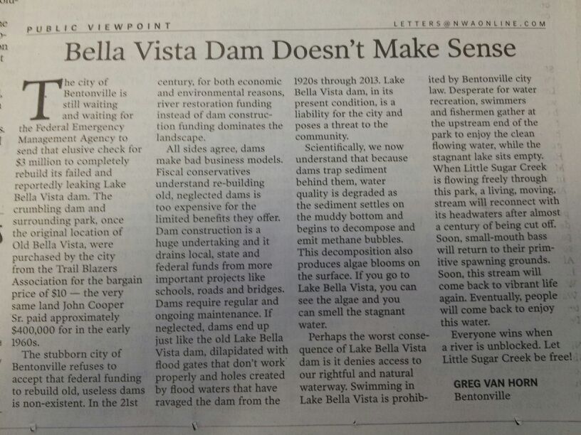 Thank you, Luke, Tracy, Jerry, Byron, Tom, Michael, Debbie, Charles, Richard and everyone else that has given permission to be copied on the letter. Mayor McCaslin has said, "there exists no interest in removing this dam..." So, we are going to need a lot of people to explain otherwise. Never before, in the Ozarks, has a dam been removed and a river restored, that I'm aware of. But, so many cities are opting to revitalize their waterways by opening them up and creating clean, healthy places for people to enjoy Nature's gift. NOBODY is rebuilding useless dams that don't generate electricity or provide drinking water in the 21st century, because dams cause serious problems for watersheds and we know that now. If we know better, we should do better. Let's show Bentonville we know better than to build an expensive, unnecessary and harmful dam in the Natural State!