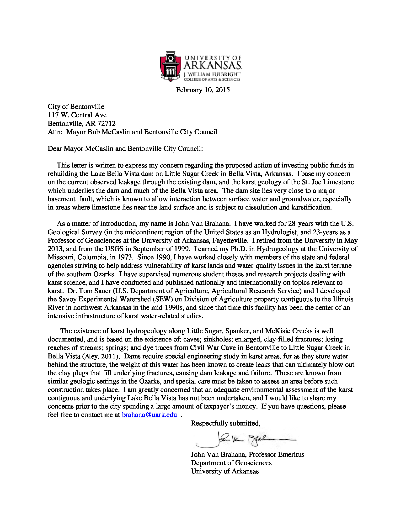 To briefly summarize, Dr. John Van Brahana, Professor Emeritus Department of Geosciences, University of Arkansas, has written a response and critique of the Draft Environmental Assessment written and submitted to FEMA regarding the Lake Bella VIsta Dam on Little Sugar Creek for transmission to Mr. Alan Hermely, Environmental Specialist, Federal Emergency Management Agency, Region VI.