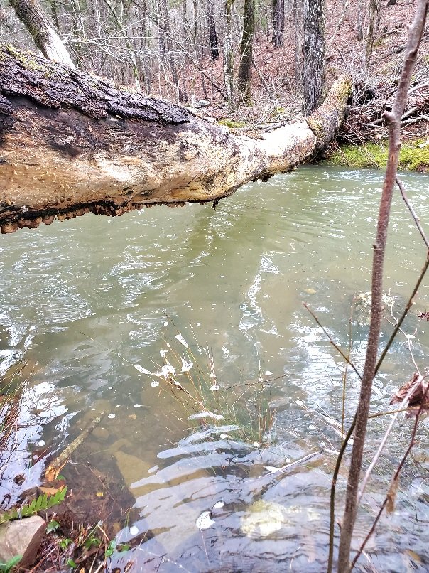 Witch Hazel Creek, Saturday, March 4th, 2023. It will be a very low water run, requiring much maneuvering with lots of sliding over rocks. Photos are from Friday, March 3, about 3 pm. Tentatively meet at noon in the Walmart parking lot on Highway 7 in Mountain Valley, just south of Hot Springs Village. This 3 mile paddling trip will NOT take place unless someone joins me. The creek has many small ledges that are close together. The first ledge is the tallest at 4 feet. One portage may be required where a large fallen tree spans the creek; it has a big eddy on the upstream side. Another tree root hazard is located about a quarter mile above the take-out and requires a move to the right into an eddy. A third tree hazard about a quarter mile below the put-in requires you to stay left to pass a low, overhanging trunk. Those 3 hazards are shown in the photos below. Comment here by 10 am on Saturday to let me know you are joining in or text me at 501-681-2314. Mike Coogan
