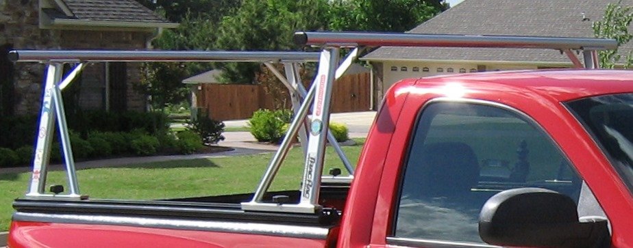 Heavy duty, all aluminum racks, 1000 lb. capacity, TracRac brand.  Rails mount on truck bed, uprights slide to adjust.  Fits 6.5' bed, could be adapted as required for a trailer, etc.
