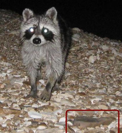 I took the picture Aug 13 at 11:58PM. It dragged my duffel bag about 20 yards from my cot (which I was sleeping on) before I awoke, realized what was happening and took it back. I went back to bed but had my camera close by and when I heard the raccoon approach I grabbed the camera and took the picture. the white eyes are a result of the eyes reflecting the light of the flash.