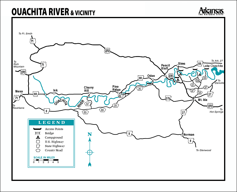 If there is water a three day trip on the Ouachita is possible & not far from H.S.....Map attached.... The Mcguire access between Cherry Hill & Ink is not on the map....Shirly Creek campground between Pine Ridge & Oden also
