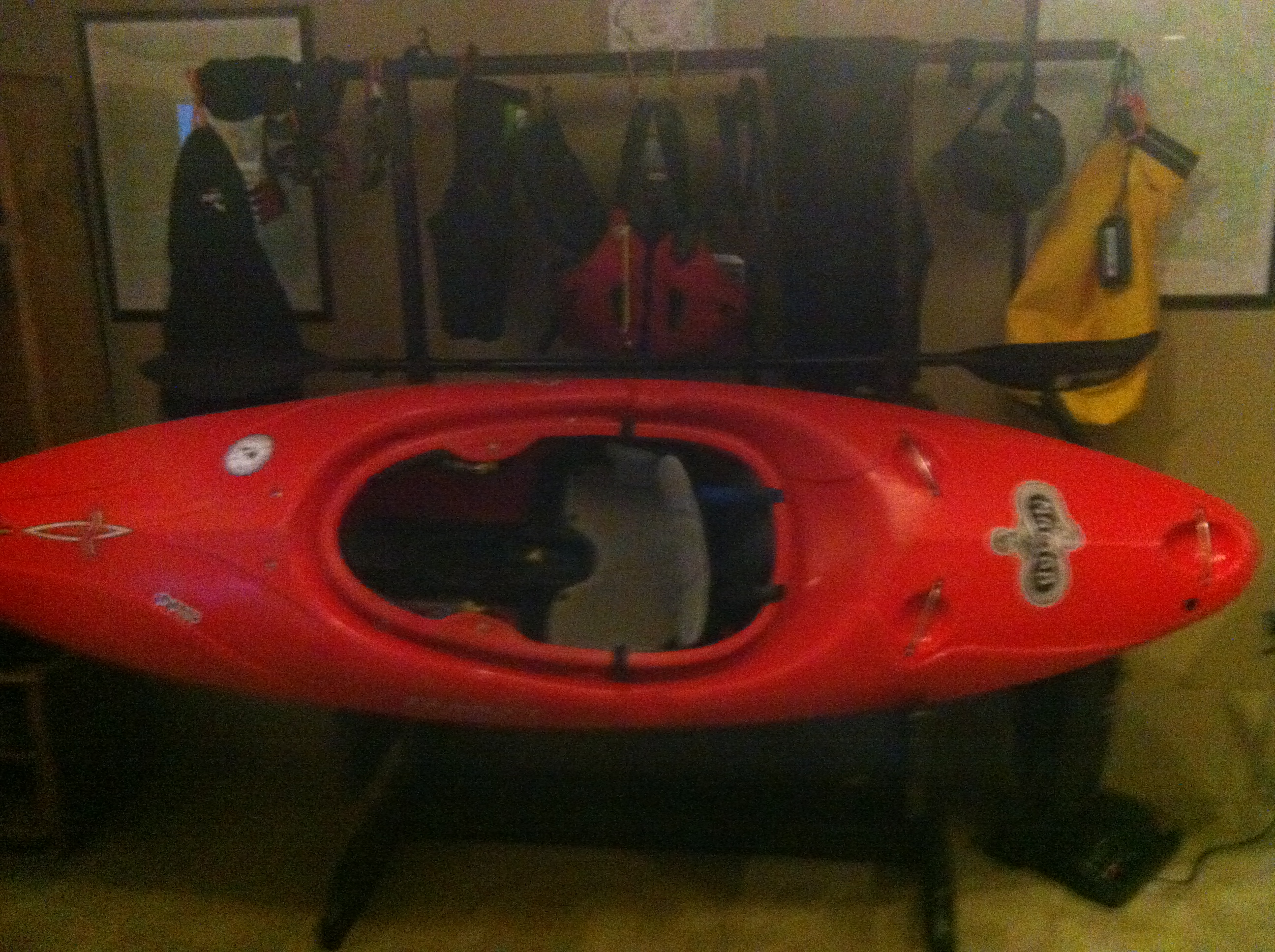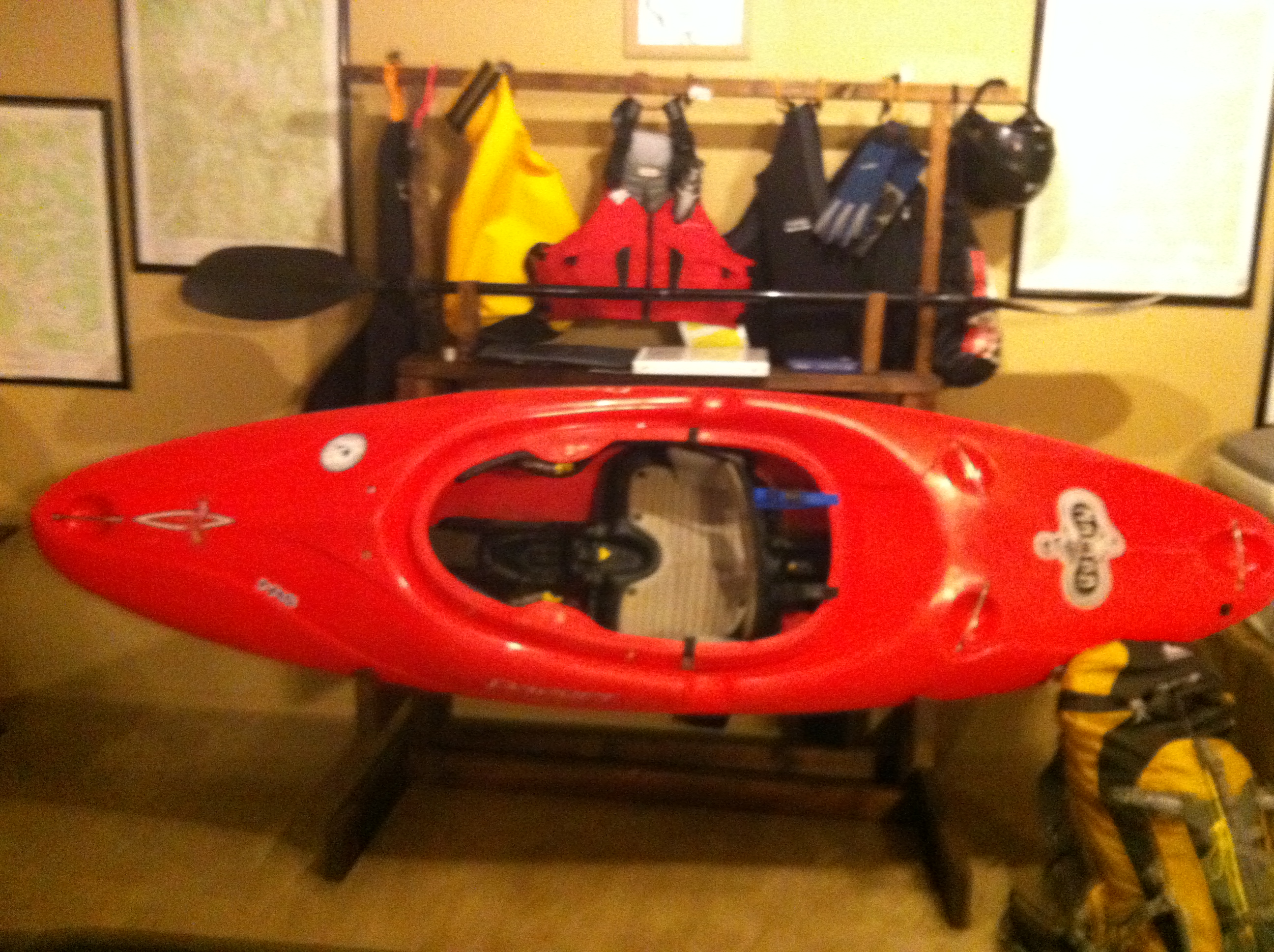 This is a hand made kayak and paddling gear stand made of wood, stained, and sealed. Its perfectly suited for interior home storage as my design had to consider aesthetics in addition to the functional requirements.