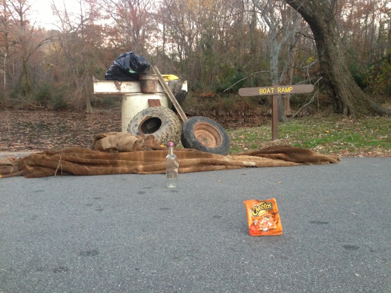 1 barrel (45 gallon?), one trailer tire, one 4-wheeler tire, small piece of a third tire, steel fence post, several pieces of rebar, large piece of carpet, wooden table, one tennis ball, one hardball, metal bucket, and about a bag of trash including several glass bottles. And two of those "bird killing" fish hooks - the kind hanging from a tree limb.