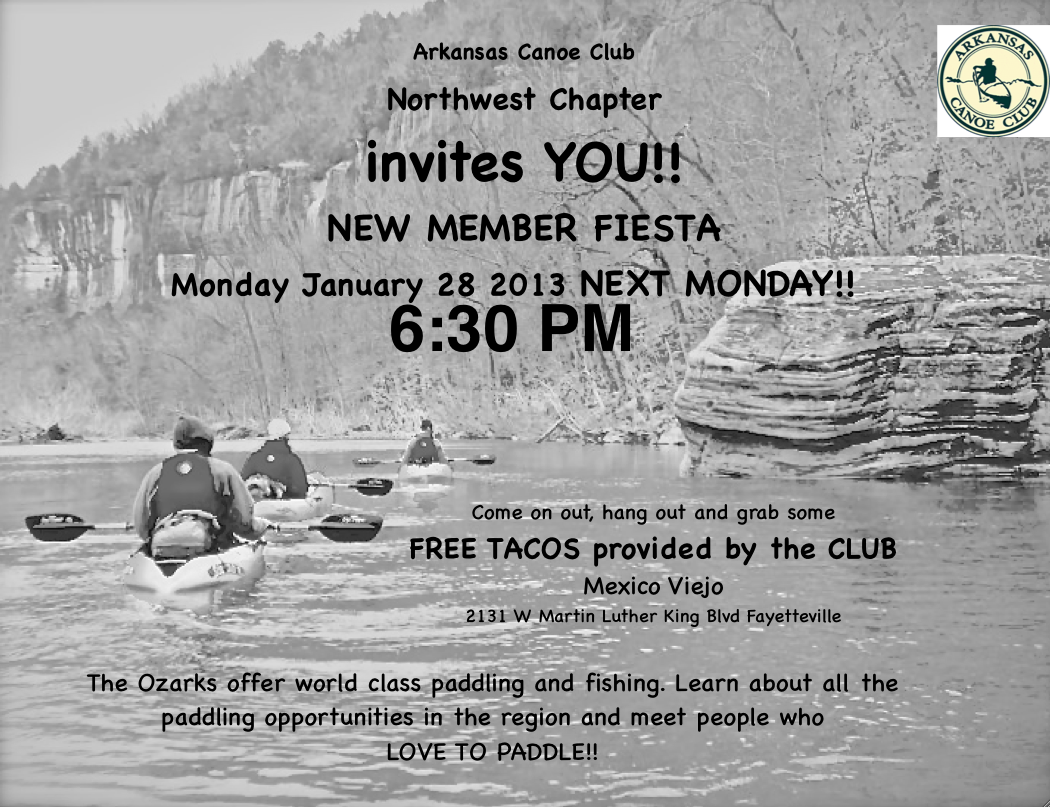We will have brief presentation on Paddling Fun in NW Arkansas: what are the essentials, basic gear, locations, logistical considerations (shuttle), legal, etc.