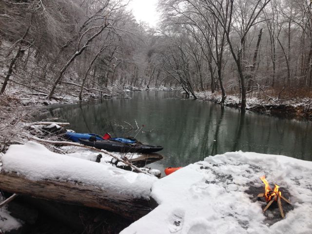 There are multiple new trees down on the Pinnacle Springs to 65 run; 4 if I remember right. One at the start of the rapid before lunch spot, two in the rapid after the geocache site, and one blocking the entire left side of the s-turn rapid - go right. At today's level (2.6) we were able to get by all of them without portaging. They would cause problems in the 3.0-4.0 range and a couple of them probably aren't going anywhere without some help. Other than that it's a winter wonderland out there and a great day on the creek, just make sure to not get clotheslined.