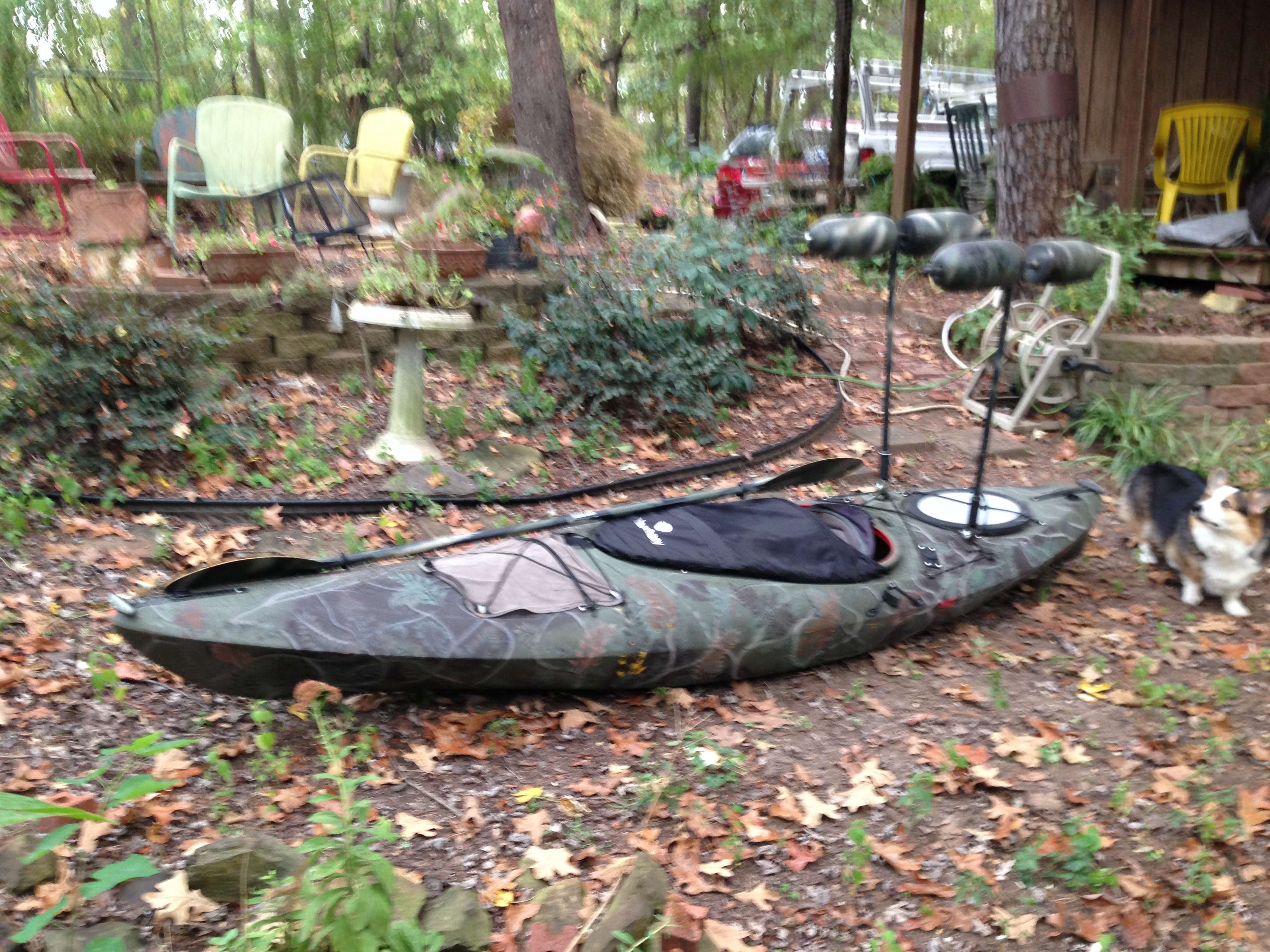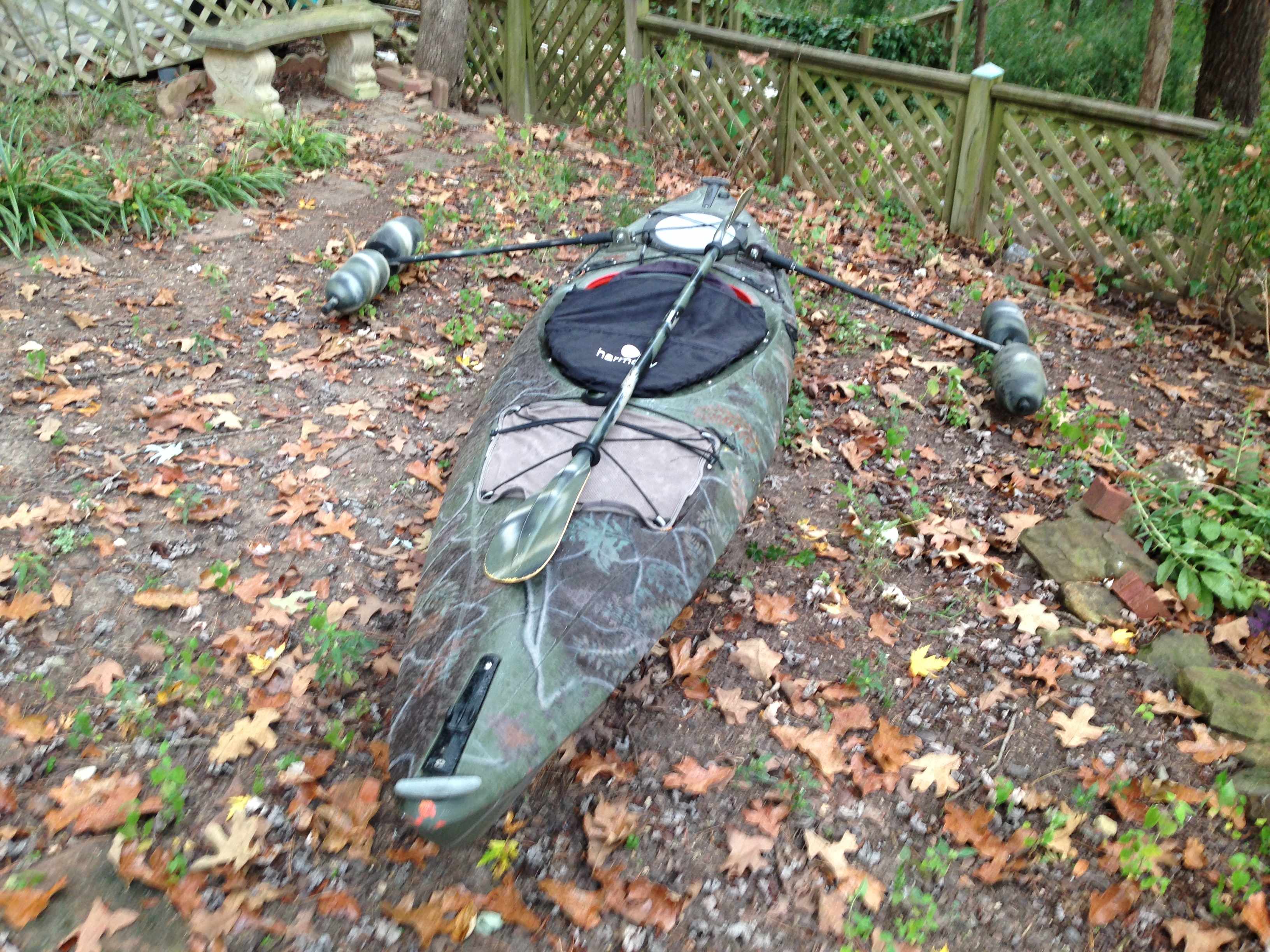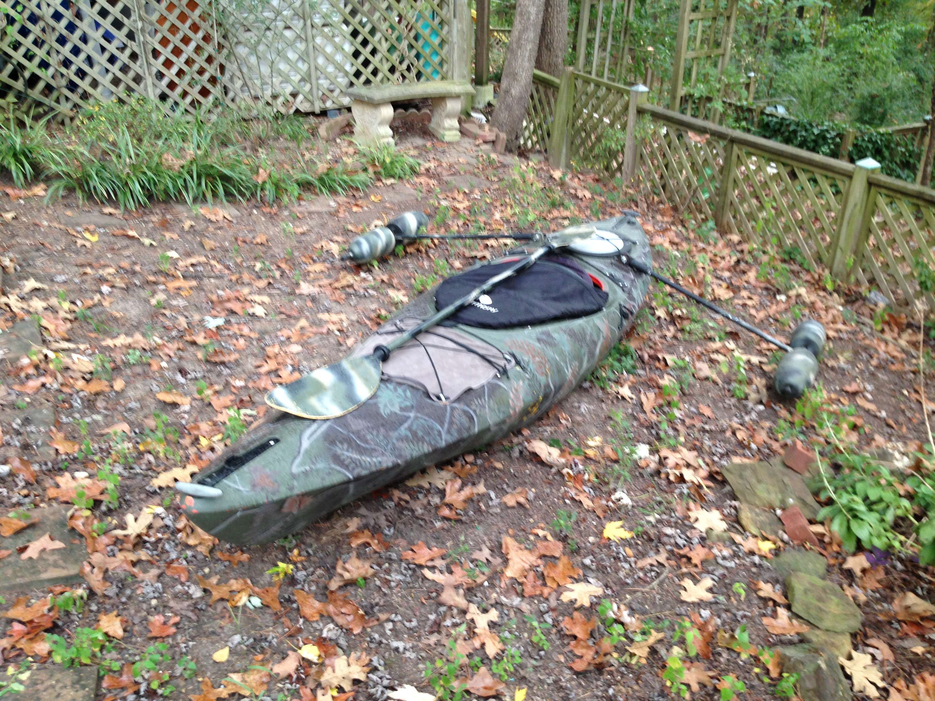 Dagger Axis 10.5, Werner Carbon Fiber 2 piece paddle, Harmony bikini spray skirt and pontoons. All camouflaged for photographing wildlife. The pontoons make it very stable and save from rolling and loosing your camera equipment, they are easily removable and adjustable.