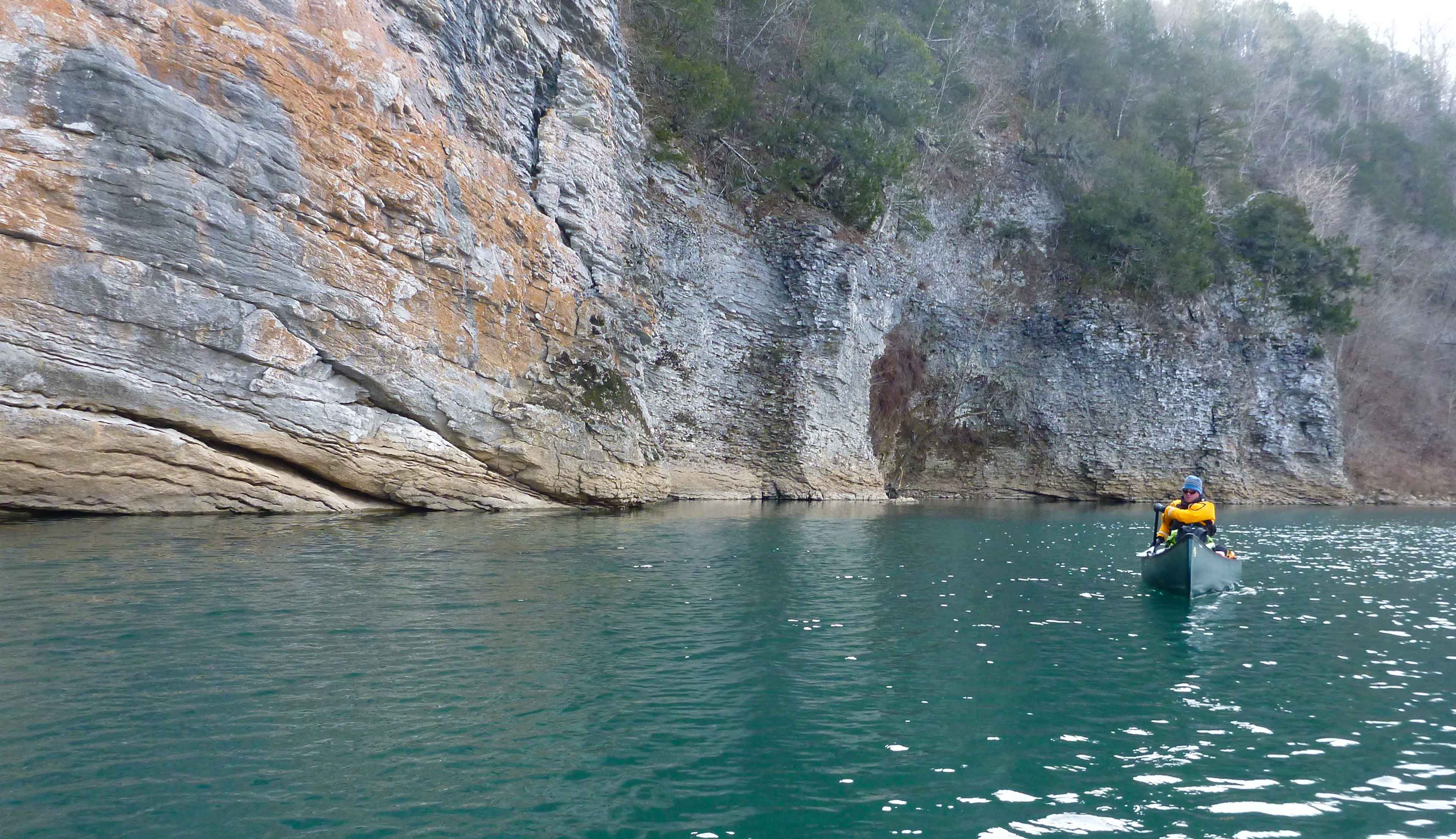 8 of us camped at Woolum on Friday evening and the others met us Sat am. A couple of us got up early on Sat. and hiked to the Narrows on the OHT. We ran our own shuttle and got on the river by noon. Temps were in the 70s and for the most part the high winds were at our backs pushing us down the river. We stopped at Jameison Bluff to have lunch and play some bocce ball. We took advantage of the warm weather and floated all the way to Peter Cave Bluff and pitched camp. That left us with about a mile to paddle out on Sunday. Good thing, it was cold (~25 degrees) in the morning but the sun was out so it felt warmer.