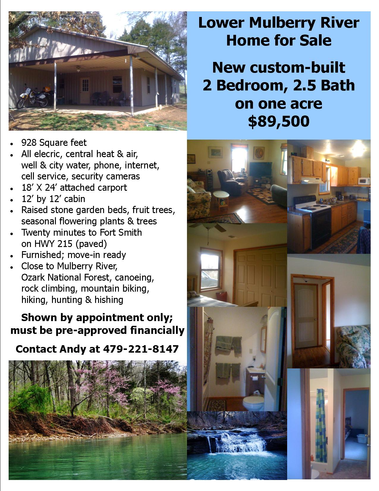 If anyone is interested in a new smaller home on HWY 215 near the Lower Mulberry, please contact Andy 479-221-8147.