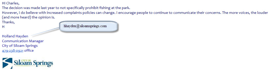 Re: Siloam Springs Kayak Park Fishing Ordinance