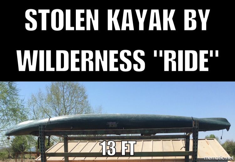Stolen Wilderness "the ride" 13ft kayak. It's modified and has several unique features. There will be no seat and plug due to us taking off for storage. It is the older model. Was stolen from Ozark Arkansas we live very close to the mulberry so keep an eye out please. Contact Misti at 479-209-0178 or Franklin Co Sheriff