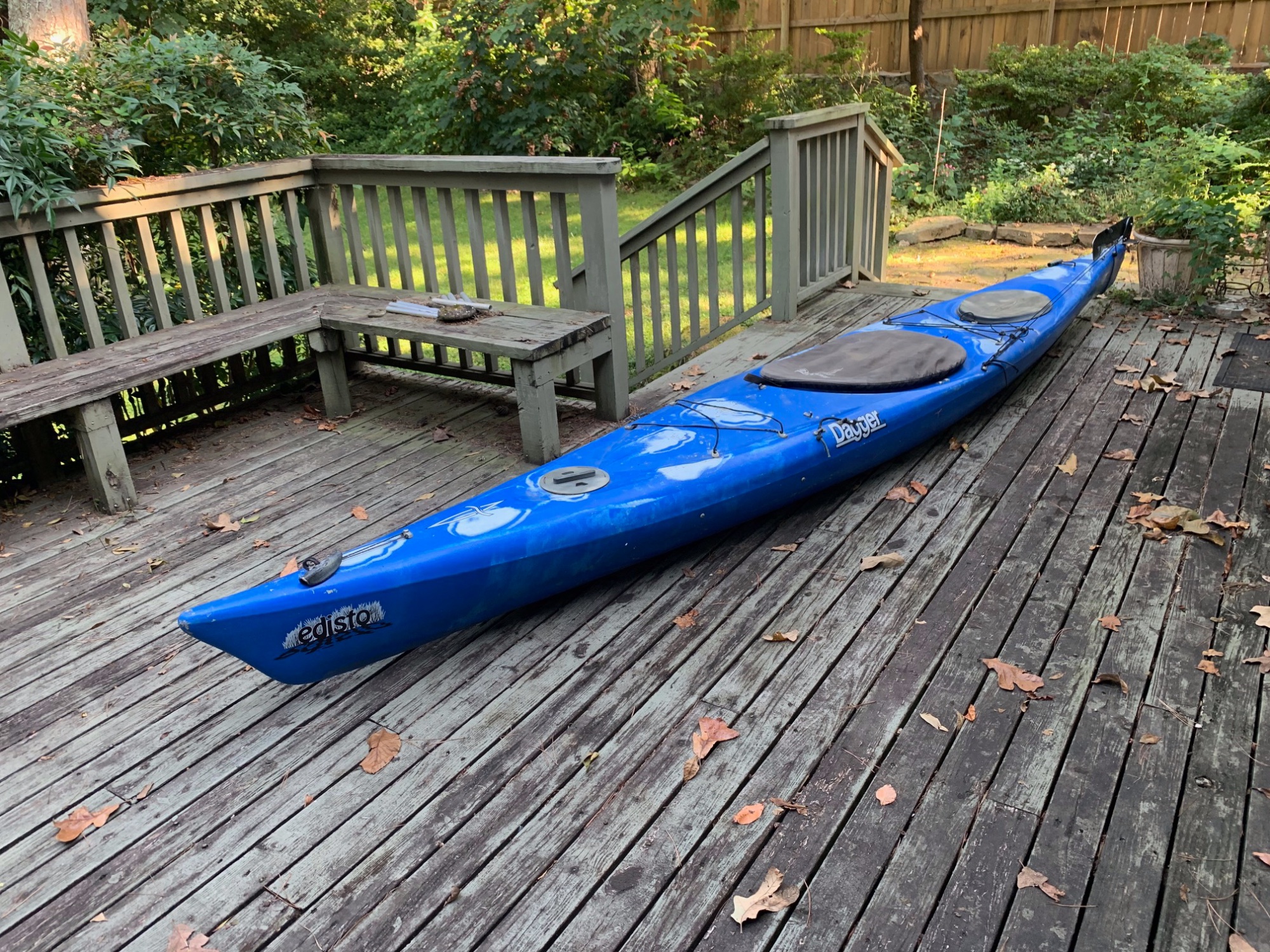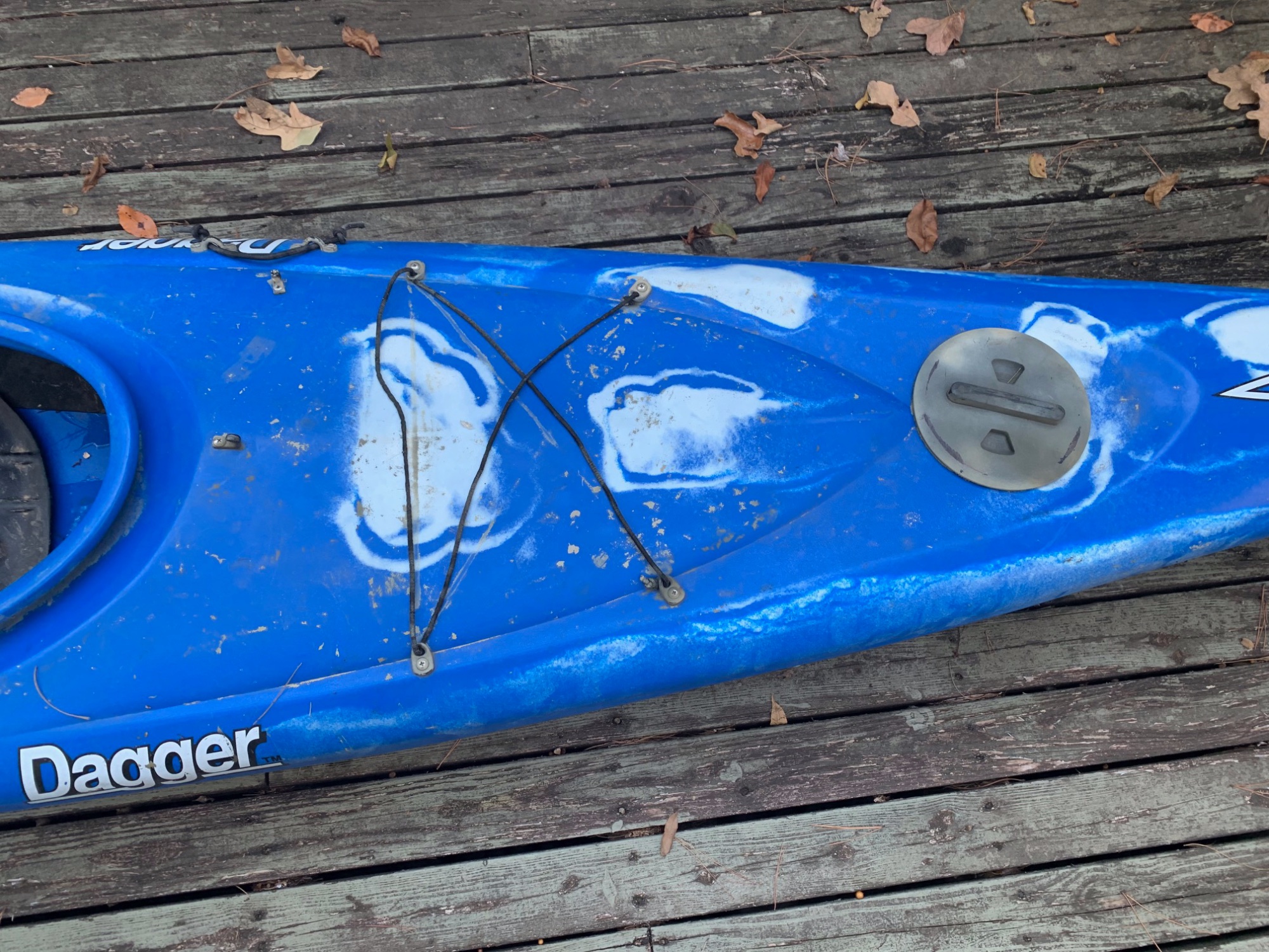 14 ft Touring Kayak with rudder, stern hatch, bow day hatch and cockpit cover. In great condition. $400. Great river, bayou, and lake touring boat. We have had many a wonderful trip together. Plenty of room for packing camping gear. Really versatile and functional. Blue in color with some flecks of old gray paint - long story. Includes the piece to hold the rudder in place.
