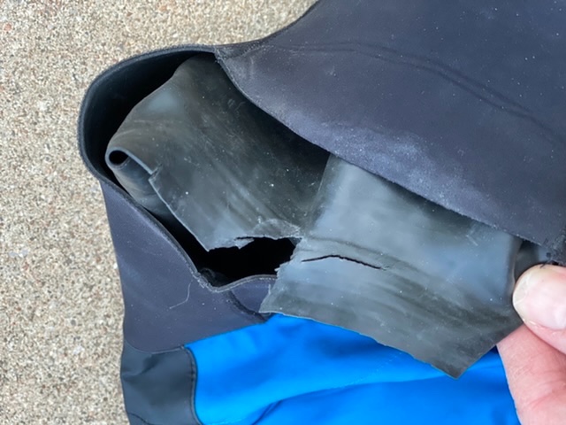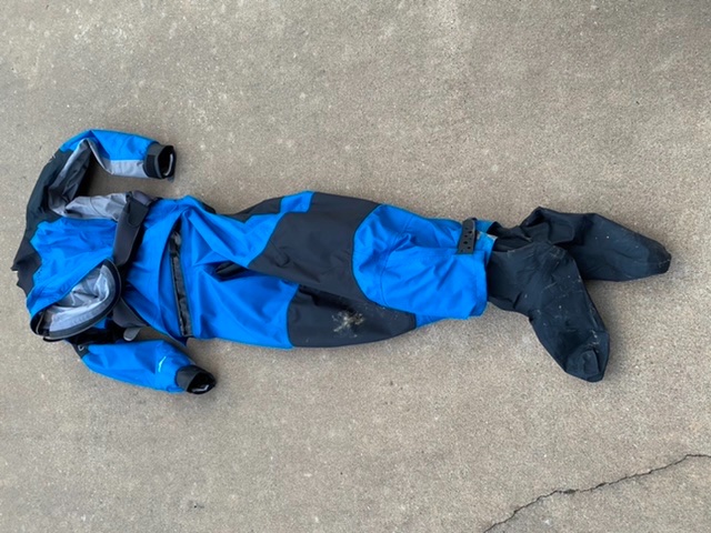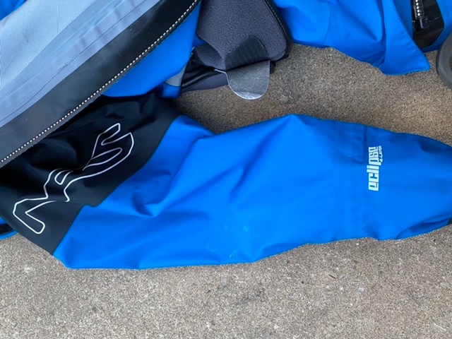 This is made of Eclipse fabric. Bought new, but I have not used it as much as I expected since I typically paddle on warmer days. Overall very good (to excellent) condition, but there are some tears in the latex neck gasket (see picture) and an adhesive separation of the Velcro from the tab on the part that mates to a sprayskirt. I am 5’9” and approx 197 lbs with 29” inseam and waist size of approx 39”. I generally wear XXL size in NRS outerwear (dry top, wet suits, etc). This drysuit fits me very well.