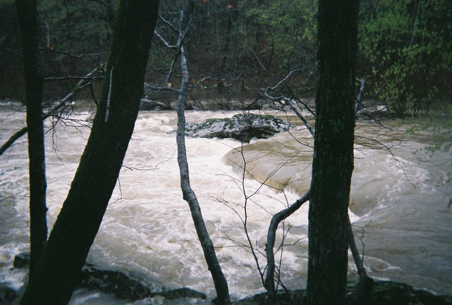 There was a group of five of us that went over to the Hailstone on Tuesday to run it at what was 6'6" and falling when we left Fayetteville. However, while on the drive over the rain increased and resulted in a level of about 7' when we put on. We knew it would be a challenging level, but while we were on it the level continued to rise, cresting at just under 8'. To say the least, we had our hands full! There were wave trains that were probably 50 yards long and 4-6'+ in height. Of course, they seemed about 20' high from kayak cockpit view. Many of them were curling waves and completely poured over and engulfed the paddlers, leaving you to just keep the paddle humming so as not to flip. Probably the trickiest part, at least for me, were the strong whirlpools and eddy lines that, when encountered felt like someone was reaching up from your side and grabbing your chinstrap, trying to pull you over sideways. Holes were plentiful, and without a doubt Deliverance Falls was the king of them all. Fortunately, we had pulled over to take a quick lunch break when we noticed Deliverance Falls just below our position which gave us an opportunity to scout it. Here's Deliverance Falls, the same spot, at about 5' level.Needless to say, we opted for the sneak route on river right, which under ordinary circumstances would have been a tricky path on it's own.