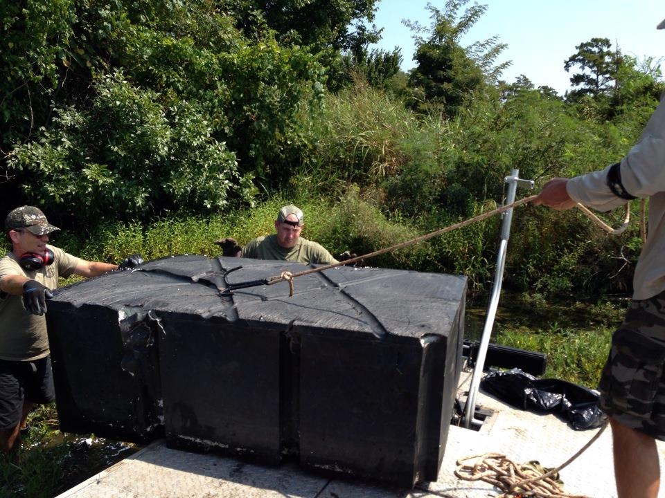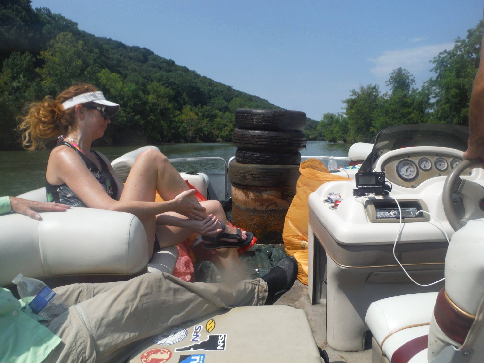 Trip Report: Good turnout today; 1 airboat, one party barge, 3 canoes, 14 people in our little group. Collections included 9 tires, 2 refrigerators, 2 large dock floats, 2 porcelain toilets, a toy machine gun, and somewhere between 1/2 to one dozen large trash bags of of smaller stuff. We knew we had done good when the Army Corps camp hostess wanted names and phone numbers for who was going to come get the stuff, and the city dump truck showed up, immediately got on the phone to someone back at headquarters, then loaded only 1/2 of it, and said they would need to send a truck with a trailer to get the rest on Monday. The canoes got about one half of the tires and one of the toilets, so it was clear that everybody was doing their share!