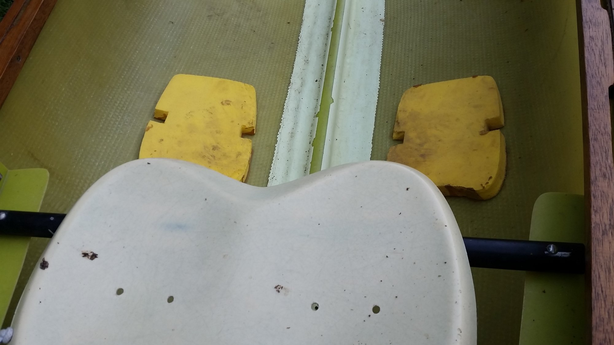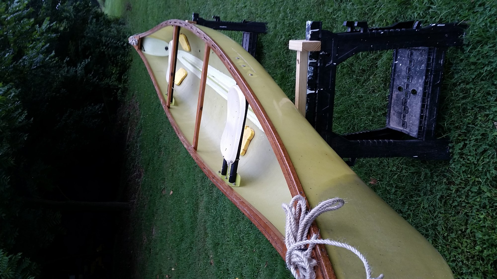It is a fiberglass and wood construction with built in flotation chambers.