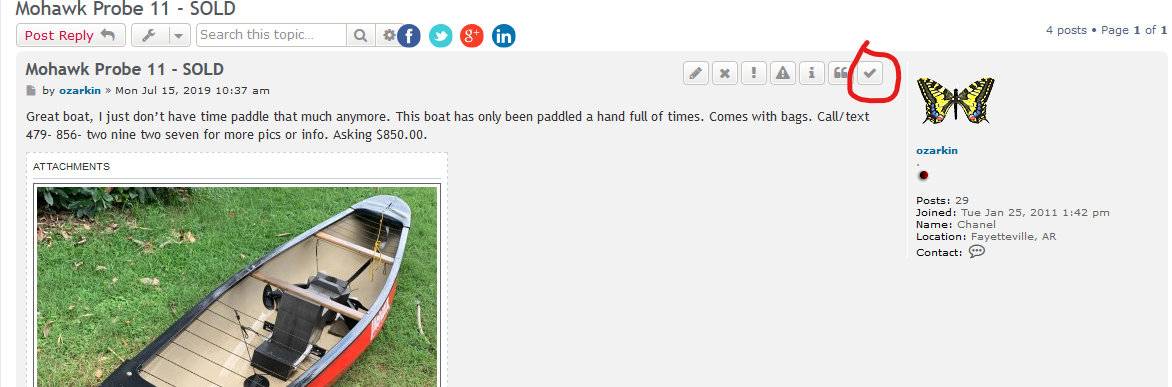 Great boat, I just don’t have time paddle that much anymore. This boat has only been paddled a hand full of times. Comes with bags. Call/text 479- 856- two nine two seven for more pics or info. Asking $850.00.